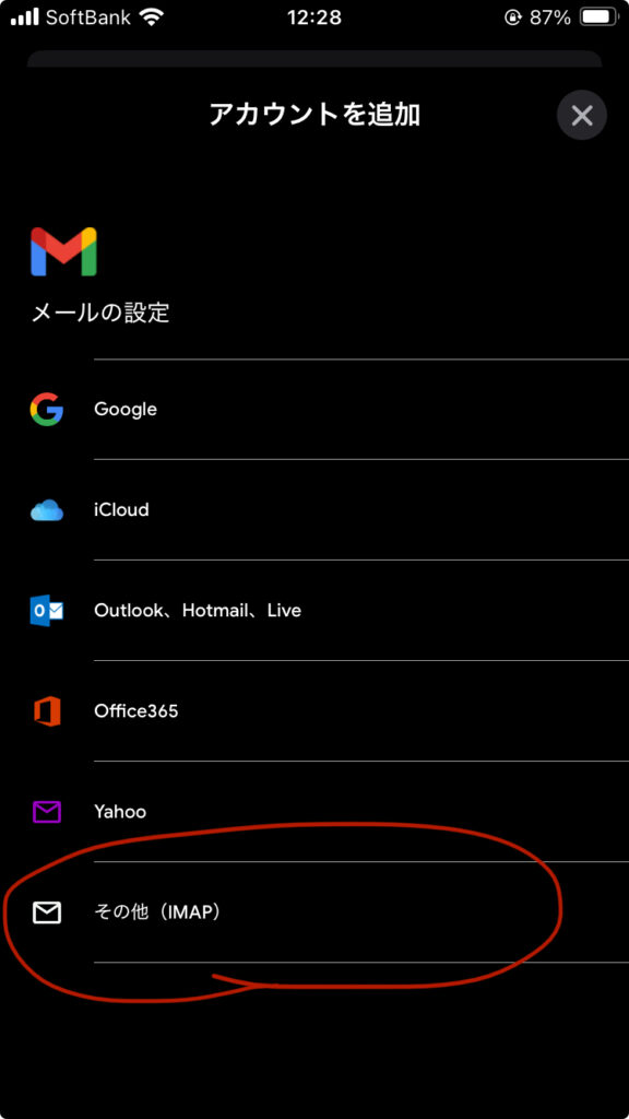 一番下にある「その他(IMAP)」を選択します。